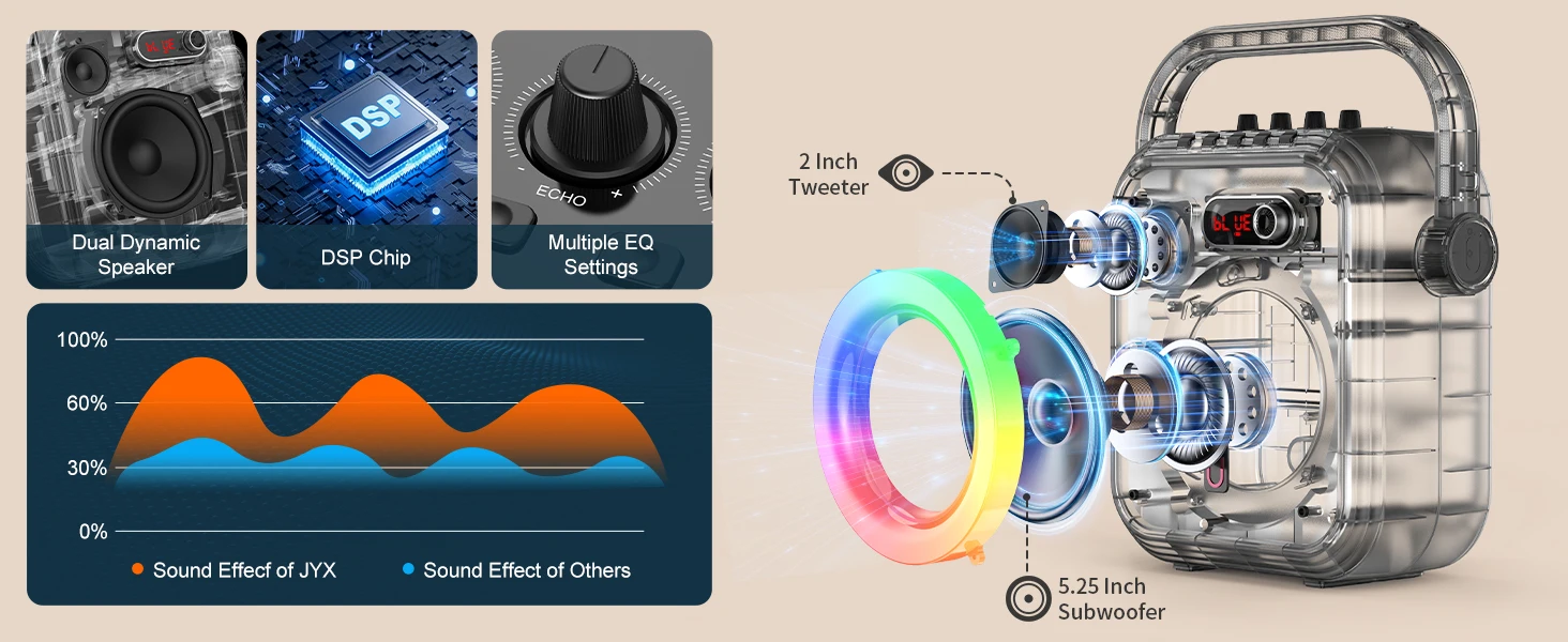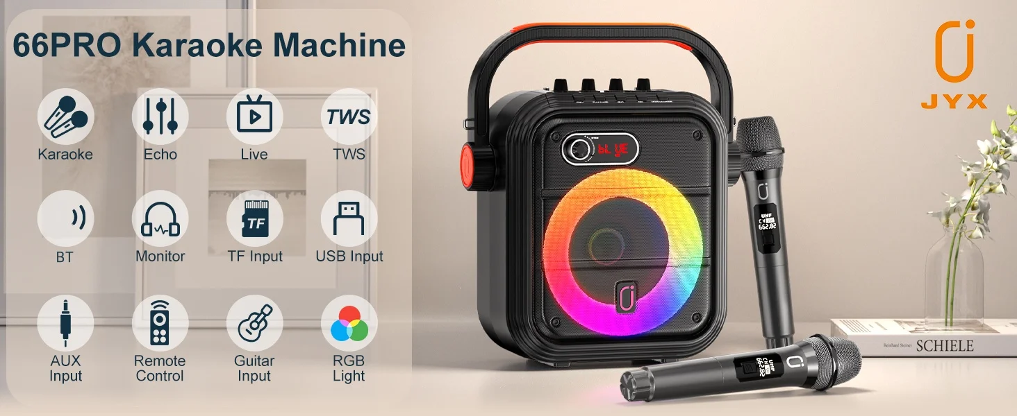 Captivating sound quality, captivating experience: the JYX 66PRO portable karaoke machine has a built-in 5.25 inch full-range driver, paired with a down-emitting subwoofer and a uniquely constructed acoustic chamber. This combination delivers rich, multi-layered sound with exceptional clarity in the bass, mids and treble. Experience a powerful soundstage that fills any room and 360° surround effects that overcome the space - perfect for immersive vocal sessions even in multiple rooms.