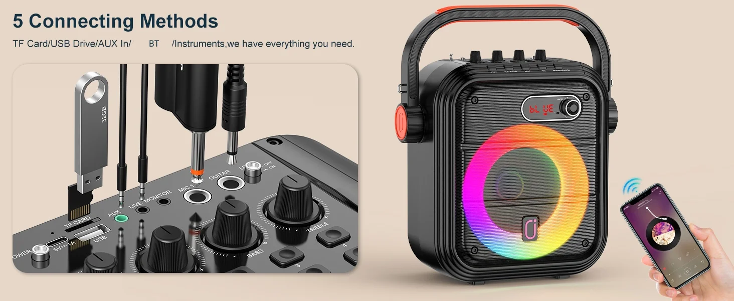 Karaoke Machine with 2 Wireless Microphones, Portable Bluetooth Speaker with RGB Light, Supports TF/USB, AUX, FM, Rec, TWS
